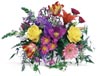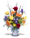 Roses, Button Poms, Iris, and Lilies in a rainbow of colors gathered in a clear glass vase. What more can we say? |
