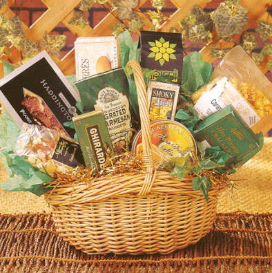 Sophisticated and irresistible. Family, friends and associates will welcome the arrival of this worldly arrangement full of choice gourmet favorites. Includes chocolate dipped hazelnut biscotti, "champagne bubbles", chocolate covered pretzels, gourmet cookies, cheese, crackers and other indulgent treats. A generous family or office gift for any occasion. (Medium Shown) |