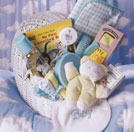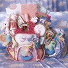 This attractive thermal tote bag comes overstuffed with practical and pretty items for both baby and parents. Features the ever lovable Tender Tails TM plush, matching onesie, bib and booties, a picture frame, plaster footprint kit, baby book, teething ring, changing pad, designer baby bottle and many more baby essentials. We've also included congratulatory coffee and candies for the parents. When ordering please specify boy or girl. |