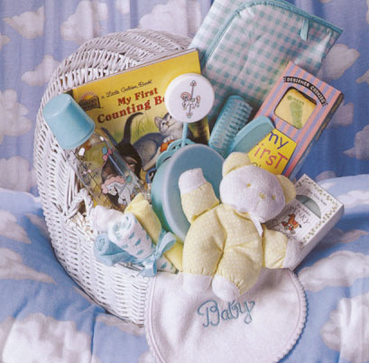 Celebrate the occasion with this adorable and reusable wicker bassinet filled with cute and practical items for the new arrival. Includes a baby changing pad, baby's first book, embroidered bib, plush teddy rattle, designer baby bottle, comb and brush set, baby soap, wash cloths and more. We've even included a late night snack for the new mom and dad; they'll need it. (Large shown) |