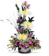 Romance doesn't have to be soft spoken. Exotic Fugi Mums, Alstroemeria, Poms and more in a modern vase make your romantic thoughts loud and clear. |