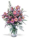 Pink Tulips, Alstroemeria, Monte Casino, Caspia and more beautifully arranged in a clear glass vase really can work miracles. |
