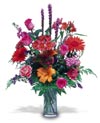 Roses, Button Poms, Iris, and Lilies in a rainbow of colors gathered in a clear glass vase. What more can we say? |