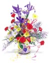 Get the confetti flying with Mini Carnations, Iris, Poms and Limonium festively arranged in a glass vase. Where's your party hat? |