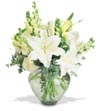 Nature makes very few pure white flowers. We've gathered some of our favorites - Casa Blanca Lilies, Larkspur, Lisianthus and Snapdragons in a clear glass vase. Pure elegance. |