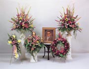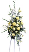 Gladiolus, Mums, Carnations, Lilies, and Greenery arranged on an easel. |