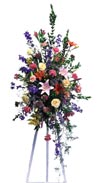 Stargazer Lilies, Delphiniums, Cream Roses, Orange Day Lilies, Pink Alstroemeria, Pink Carnations, Purple Liatris, Caspia, Huckleberry, Plumosa and Leatherleaf on an easel stand. |