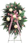 Pink Carnations, White Football Mums, Commodore, Plumosa and Bow on an easel. |