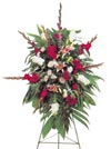Poms, Pink and Burgundy, Gladiolus, Red, Purple, White Stock, Stargazer Lilies, Commodore, Leatherleaf, Plumosa, Eucalyptus on an easel. |